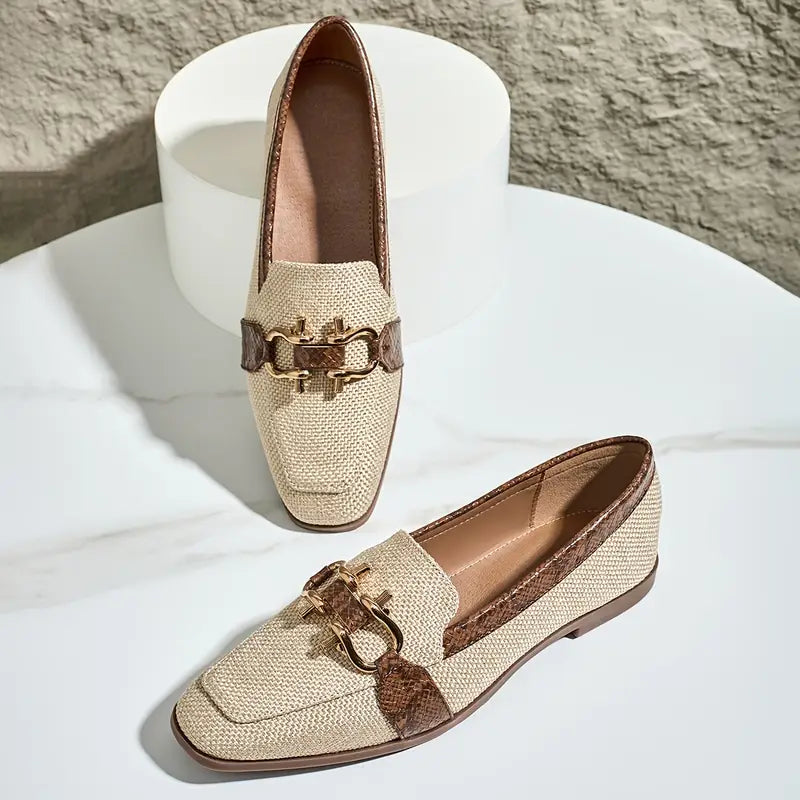Ces mocassins en fibre tressée beige avec détails marron effet croco et boucle dorée sont parfaits pour un look élégant et aéré. Leur design chic et leur confort en font des alliés de choix pour le printemps et l’été.
