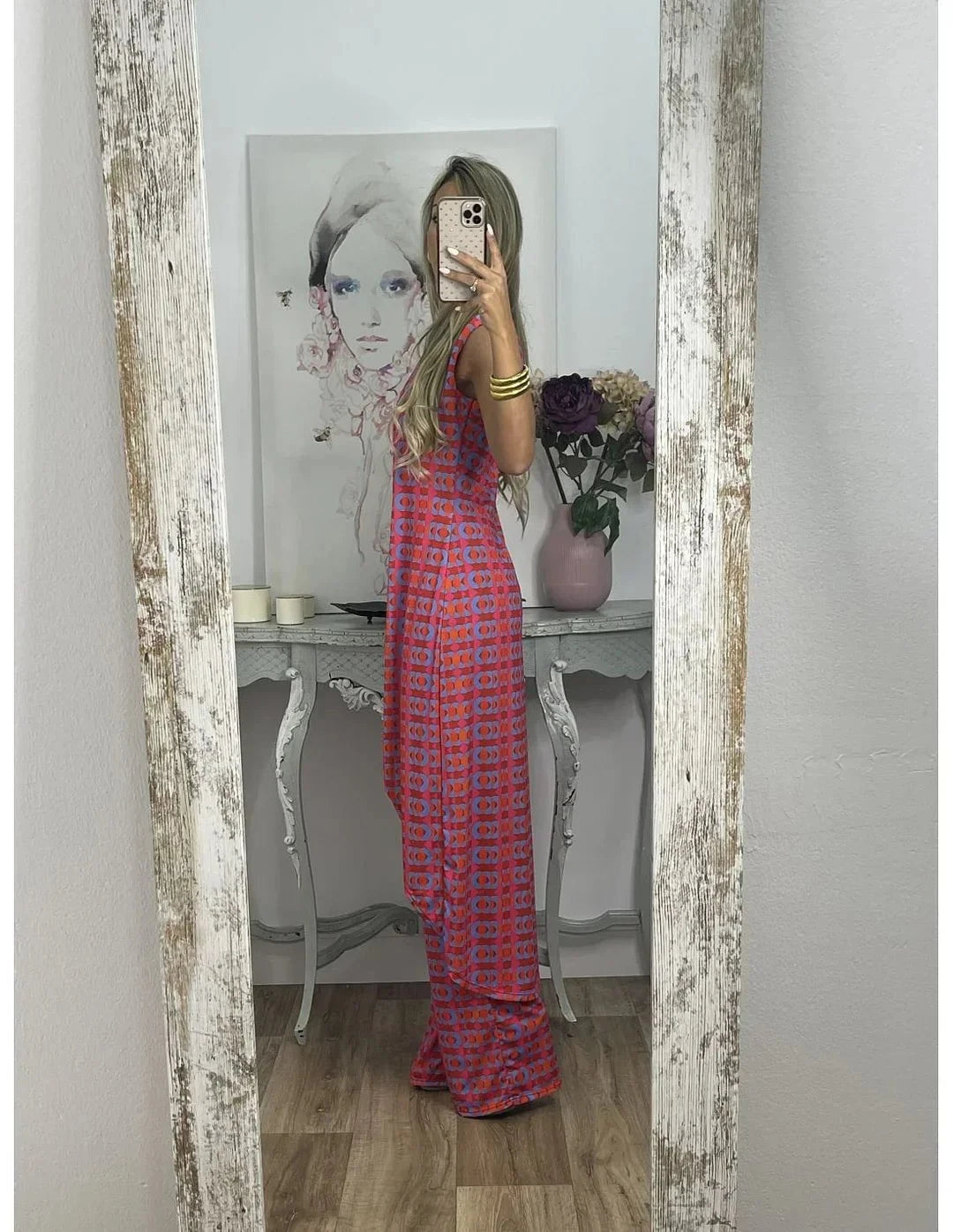 Cette combinaison sans manches se distingue par sa coupe ample et son ouverture avant fendue, offrant un mouvement fluide et un effet raffiné. Son imprimé géométrique moderne en fait une pièce parfaite pour une allure sophistiquée et tendance.