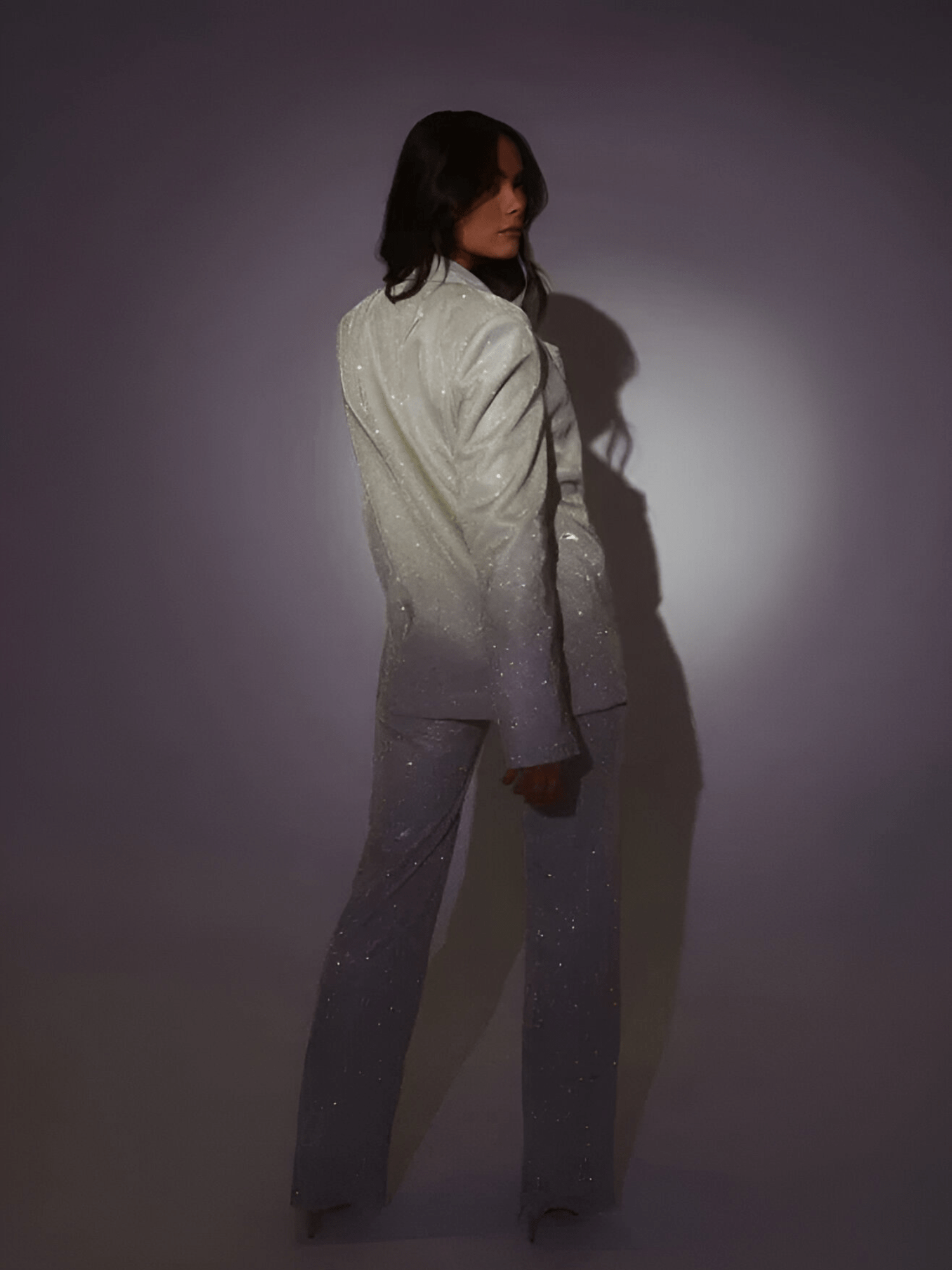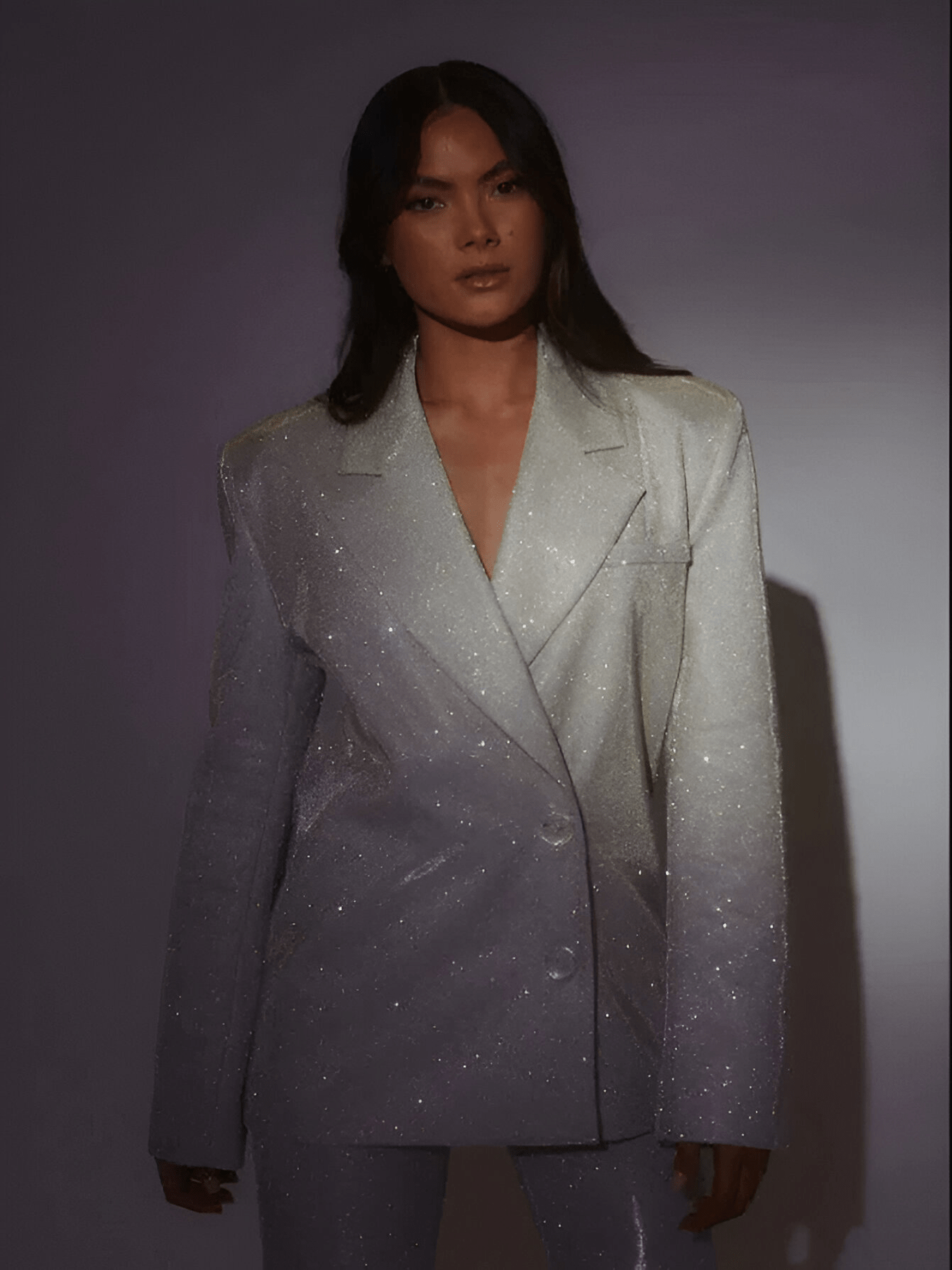 Cet ensemble composé d’un blazer, d’un pantalon large et d’un top bustier scintillant est l’incarnation du glamour. Son tissu pailleté capte la lumière pour une allure audacieuse et sophistiquée, parfaite pour les grandes occasions.