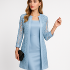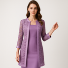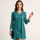 Ce sublime ensemble deux pièces, composé d'une robe droite satinée et d'une veste longue en dentelle ajourée assortie, est la définition même de l'élégance et du raffinement. Avec ses finitions soignées et son tissu délicatement texturé, il épouse la silhouette tout en offrant une allure chic et gracieuse.