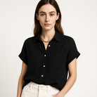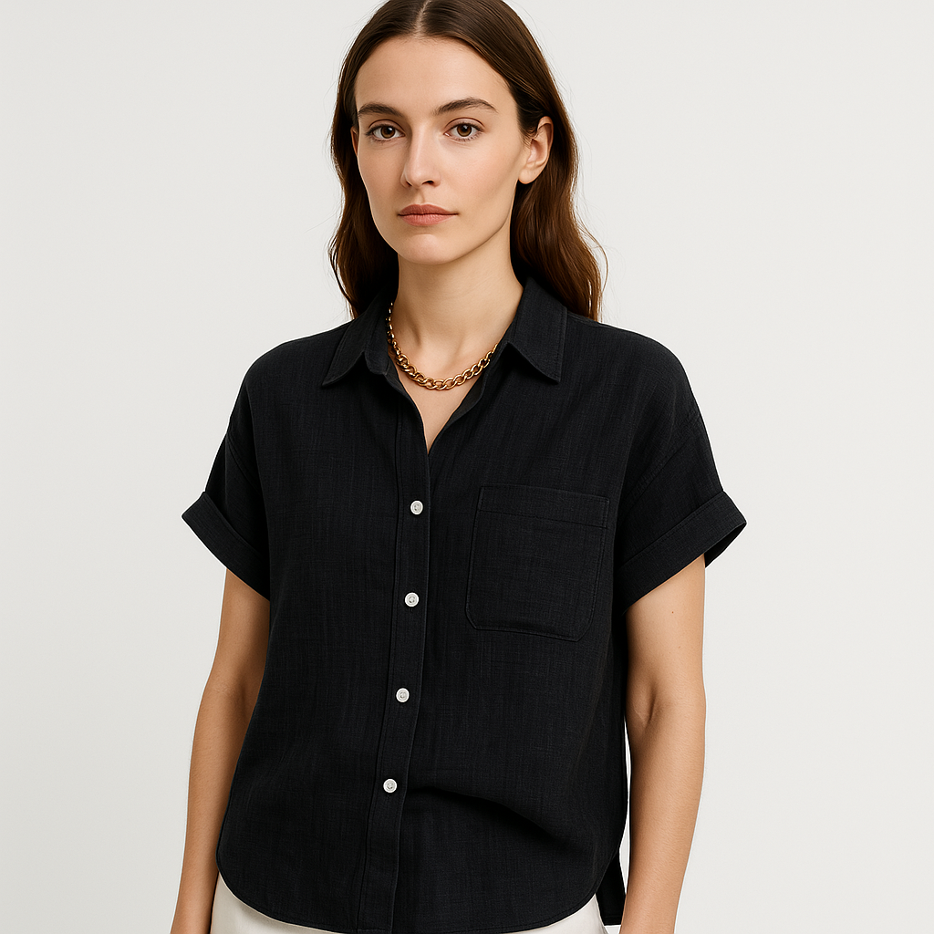 Cette blouse à manches courtes combine confort, coupe fluide et une allure intemporelle. Facile à porter, elle se marie aussi bien avec un short qu’un pantalon taille haute pour un look chic sans effort.