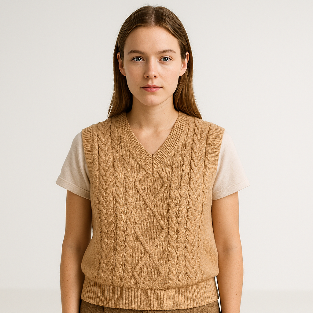 Ce cardigan sans manches en maille torsadée abricot allie chaleur, texture et style rétro dans une pièce facile à associer. Il s'adapte parfaitement aux journées fraîches où vous souhaitez garder style et confort.