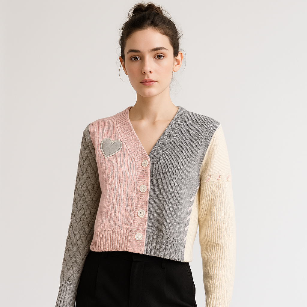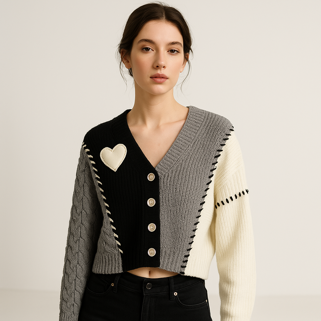 Ce gilet tricolore au design patchwork combine charme et douceur dans un style à la fois fun et tendance. Avec ses boutons contrastés et son cœur brodé, il attire tous les regards.
