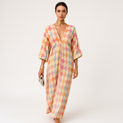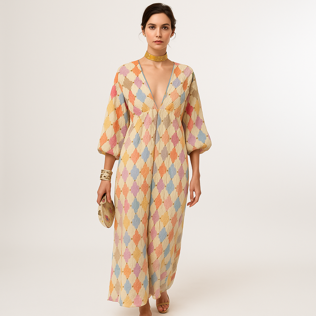 Cette robe longue multicolore au motif losange illumine votre silhouette avec une touche bohème et audacieuse. Son tissu léger et ses manches amples créent un effet aérien irrésistible, parfait pour les journées ensoleillées.