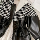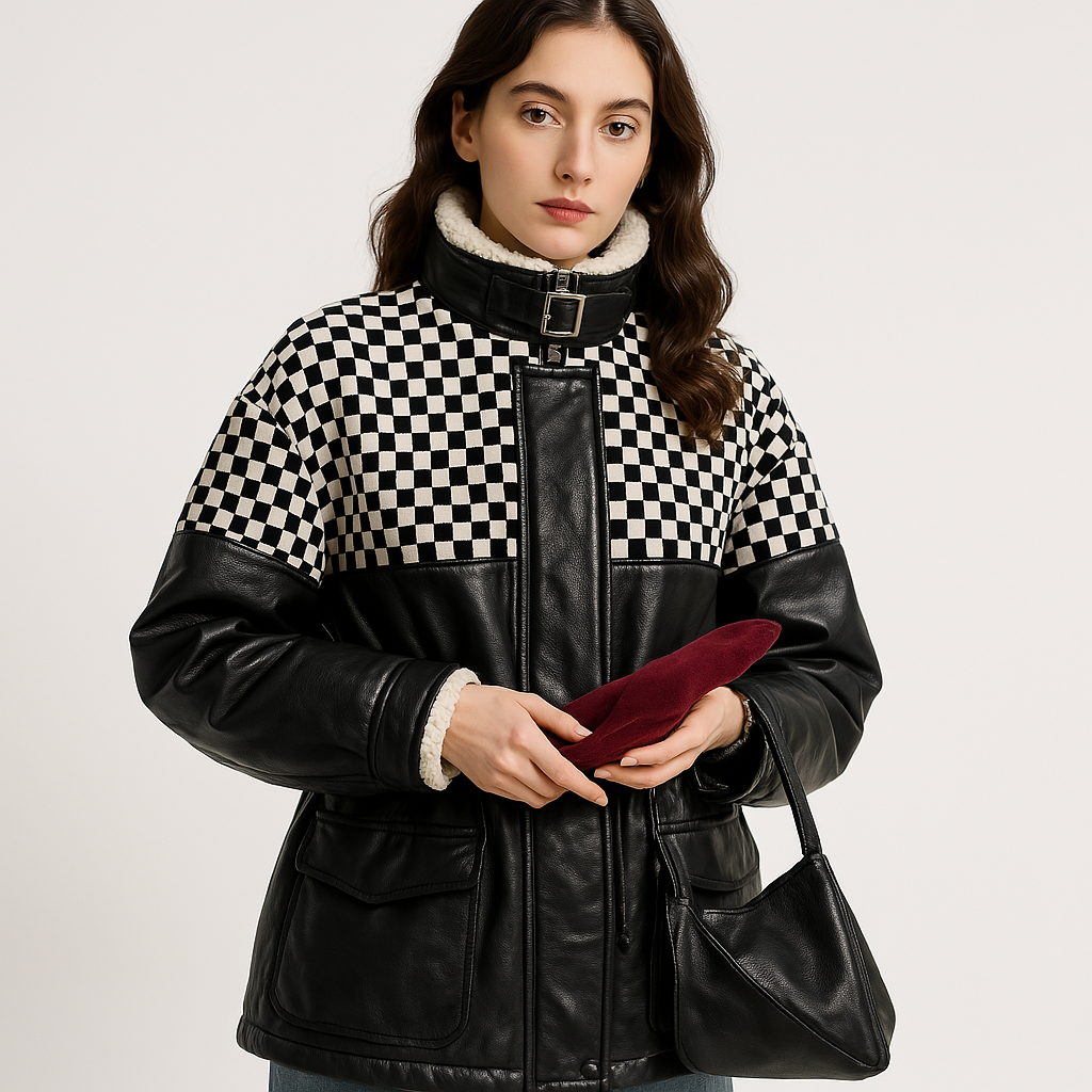 Cette veste en cuir effet mat associé à un motif damier noir et blanc revisite le style streetwear avec une touche chic et originale. Parfaite pour affronter les journées froides sans compromettre votre allure, elle mêle confort et modernité.