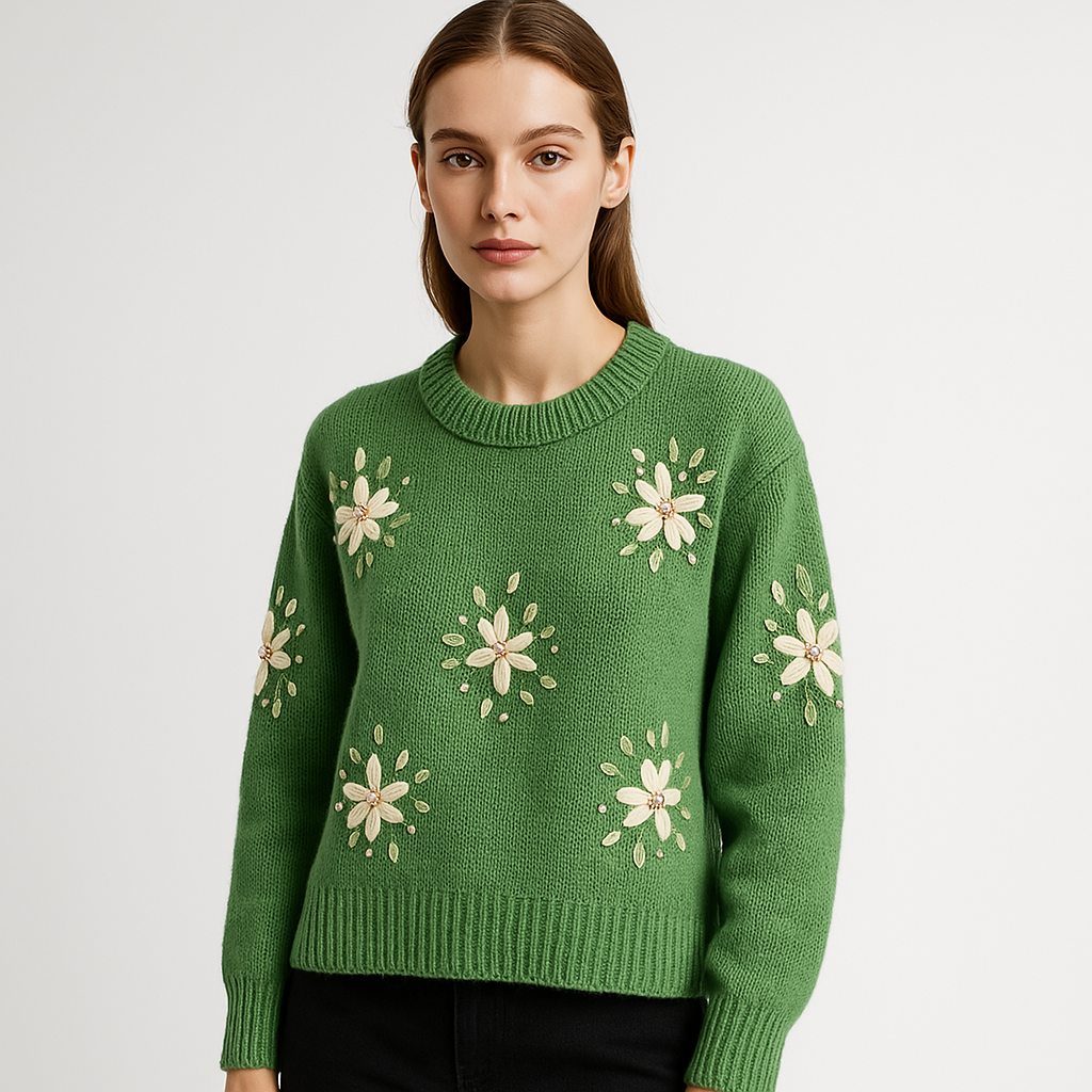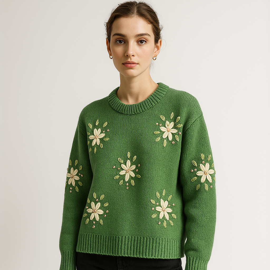 Pull Brodé Fleuri | Vert | Douillet et Romantique