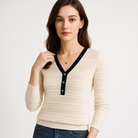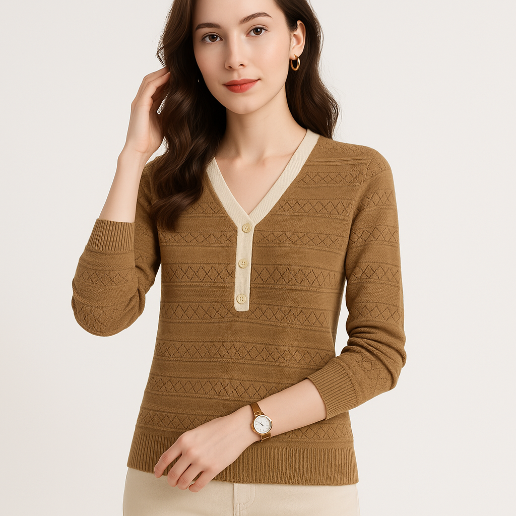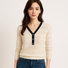 Ce pull en maille fine à col en V et patte de boutonnage contrastée vous assure élégance et légèreté à chaque instant. Son tricot ajouré discret et ses détails soignés en font une pièce incontournable du dressing féminin.