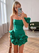 Cette robe une-épaule allie un corsage structuré à une jupe courte ornée de volants foisonnants pour un rendu ultra-féminin. Le tissu légèrement satiné offre un tombé fluide et un confort optimal, tandis que l’épaule asymétrique met en valeur vos lignes.
