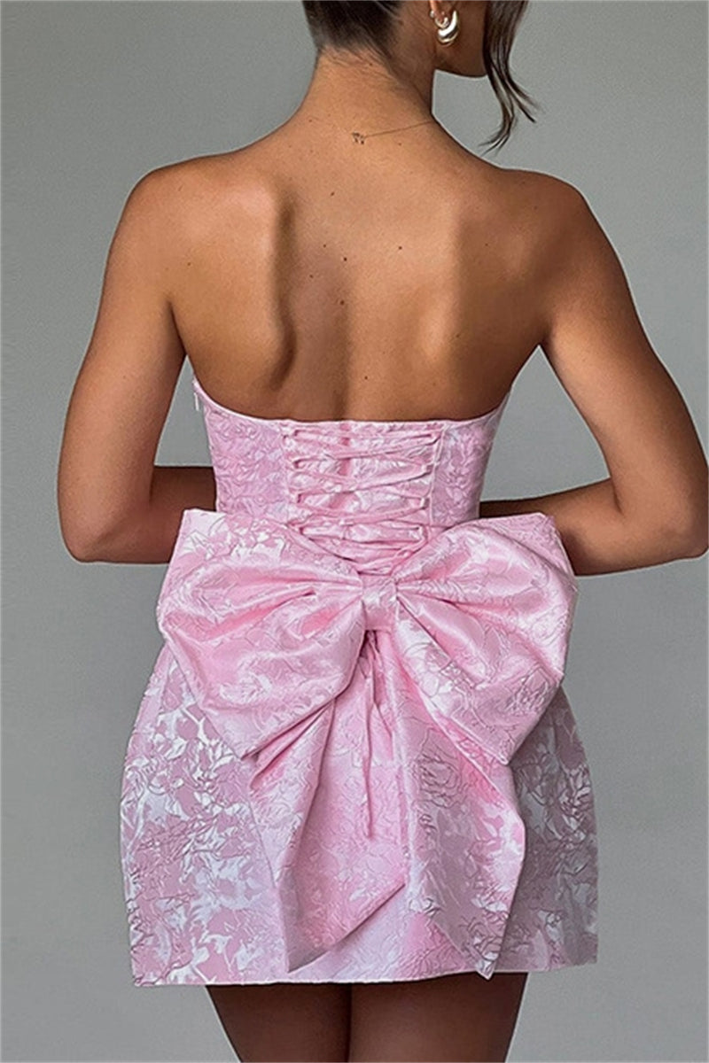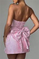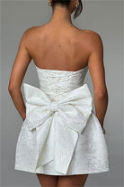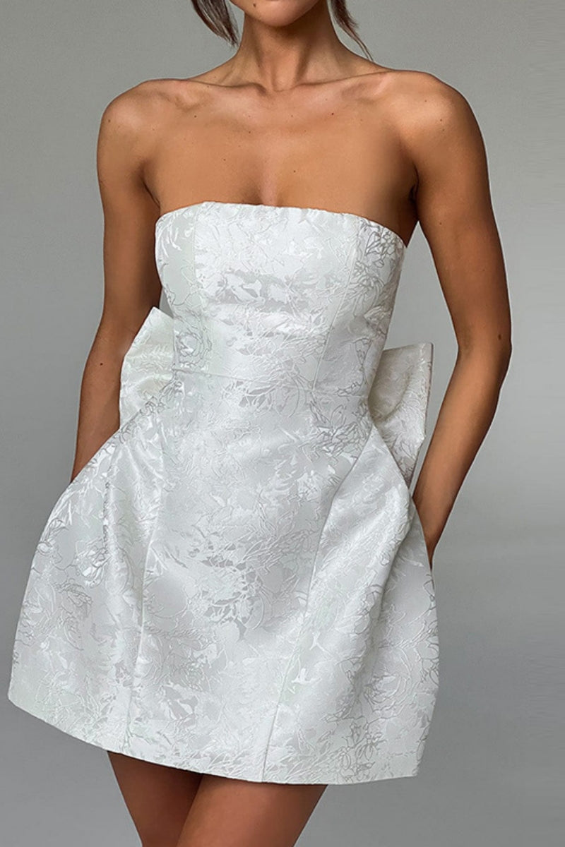 Cette mini-robe bustier arbore une matière jacquard texturée avec un léger motif floréal ton sur ton. Sa coupe trapèze et ses poches ornementales à gros nœud soulignent la taille pour un rendu chic et contemporain. Confectionnée dans un tissu légèrement satiné, elle offre une tenue impeccable et un tombé structuré.