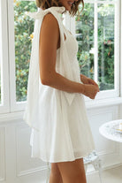 Cette mini-robe en lin léger à bretelles nouées révèle une allure à la fois fraîche et sophistiquée. Son décolleté carré structuré et sa jupe évasée flattent la silhouette avec féminité.
