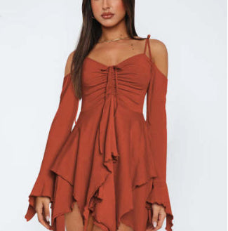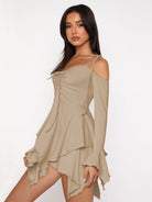 Cette robe courte à manches longues et ourlet asymétrique attire les regards avec son design fluide et sa coupe moderne. Son col noué et ses épaules dégagées apportent une touche tendance tout en restant confortable.