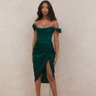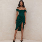 Cette robe bardot se distingue par son drapé asymétrique et sa fente latérale pour sublimer la silhouette. Son tissu extensible épouse les courbes tout en assurant un confort optimal pour danser jusqu’au bout de la nuit.