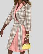 Cette robe blazer au motif pied-de-poule cache une jupe plissée contrastée pour un look à la fois structuré et raffiné. Sa ceinture intégrée souligne la taille pour une silhouette parfaitement dessinée.