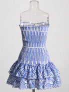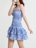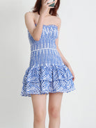 Cette robe bustier courte séduit par son imprimé graphique bleu et blanc, sa coupe ajustée et son volant fluide. Sans bretelles et facile à enfiler, elle est idéale pour les journées chaudes et les moments décontractés.