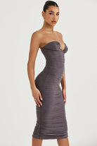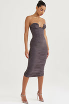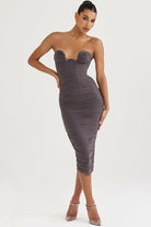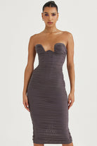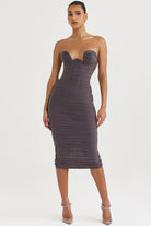 Cette robe bustier midi présente une coupe ajustée et un tissu froncé qui sublime la silhouette avec subtilité. Sans bretelles, elle met en valeur le port de tête tout en assurant une tenue structurée et flatteuse.
