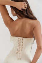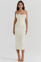 Cette robe bustier midi offre une silhouette sculptée grâce à sa coupe près du corps et son plissé délicat sur le buste. Son tissu doux et structuré épouse parfaitement les formes pour une allure sophistiquée.