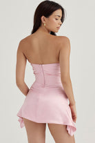 Cette robe bustier en satin offre une coupe structurée et un effet drapé subtil pour un look sophistiqué. Sa matière lisse capte la lumière avec délicatesse, parfaite pour briller avec élégance.
