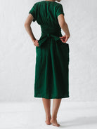 Cette robe midi à manches courtes avec ceinture nouée allie sobriété, confort et style.