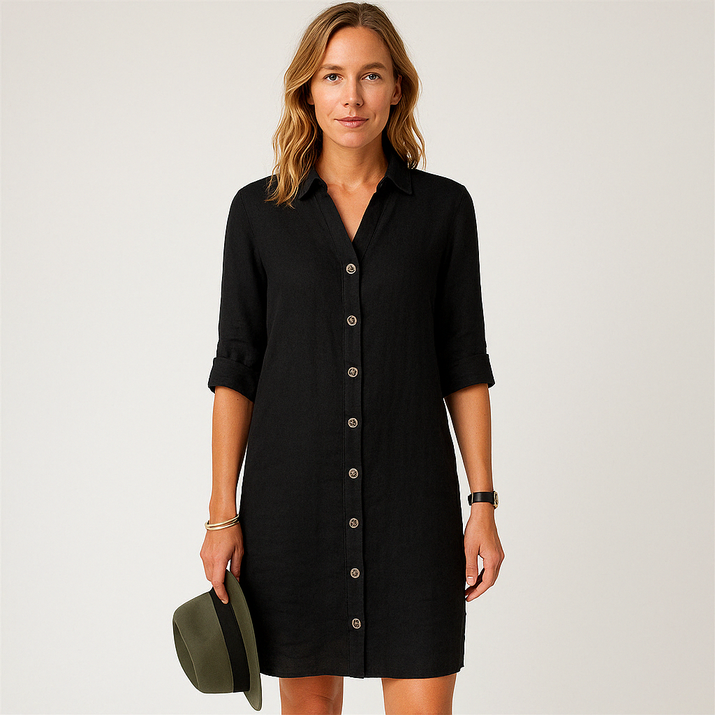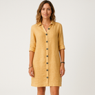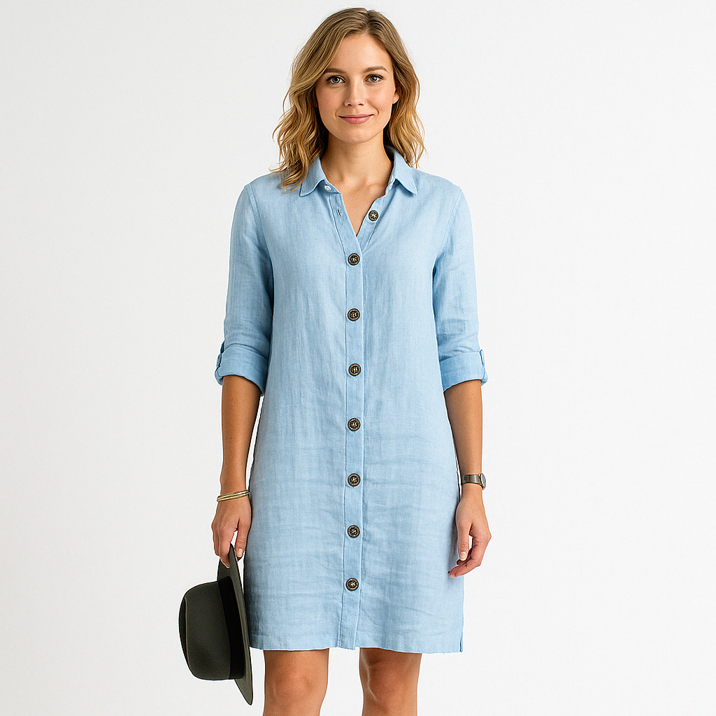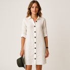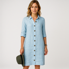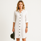 Cette robe-chemise légère à manches 3/4 et boutons décoratifs est la définition même de l’élégance décontractée. Son tissu en lin naturel, sa coupe droite et son col chemise en font une pièce intemporelle qui respire la fraîcheur.