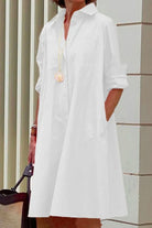 Cette robe-chemise midi revisite un classique vintage avec modernité. Sa coupe droite et son imprimé à pois contrastants offrent un look casual-chic facile à adopter.