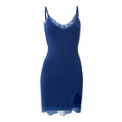 Détails : Fines bretelles, encolure bordée de dentelle, base asymétrique avec dentelle, fente discrète