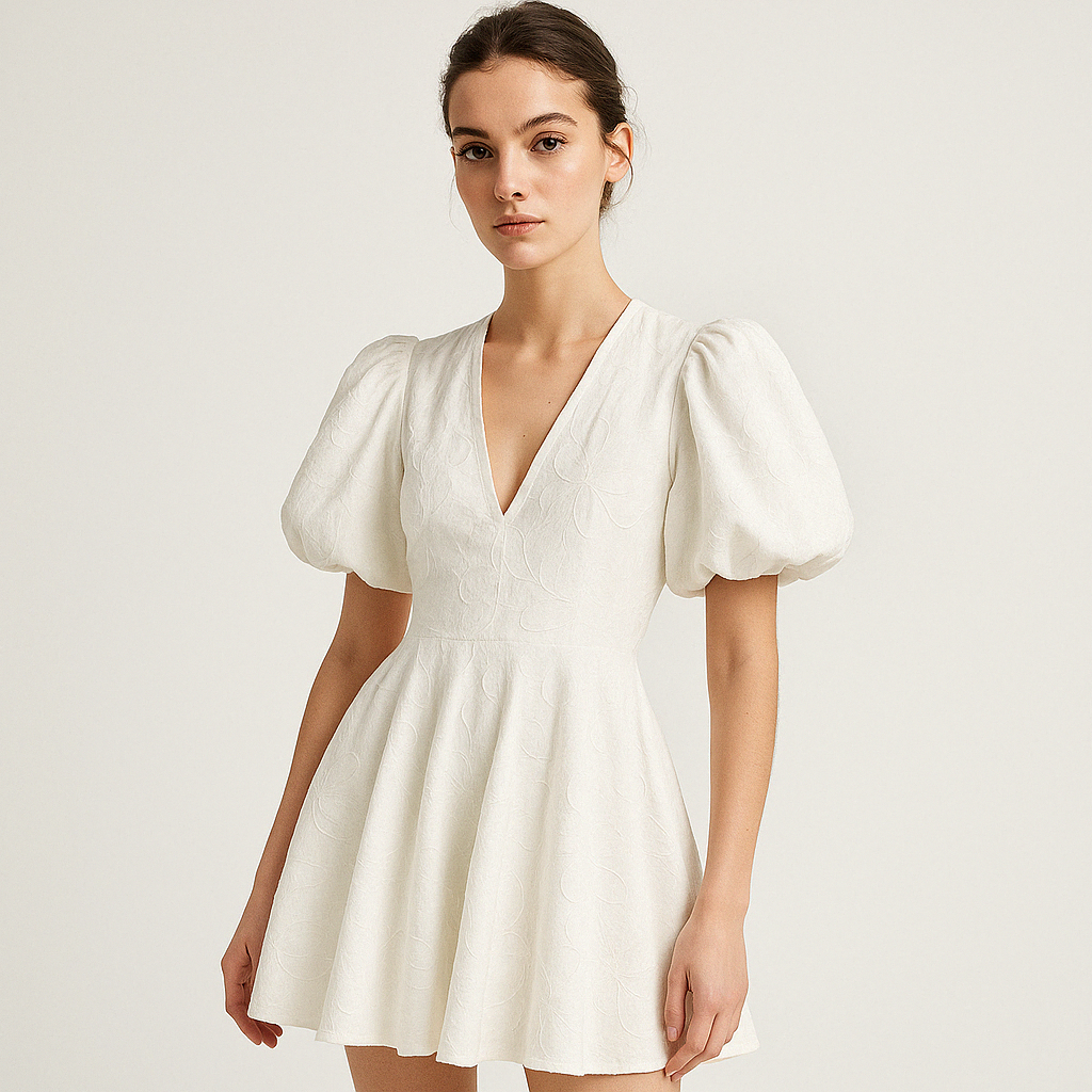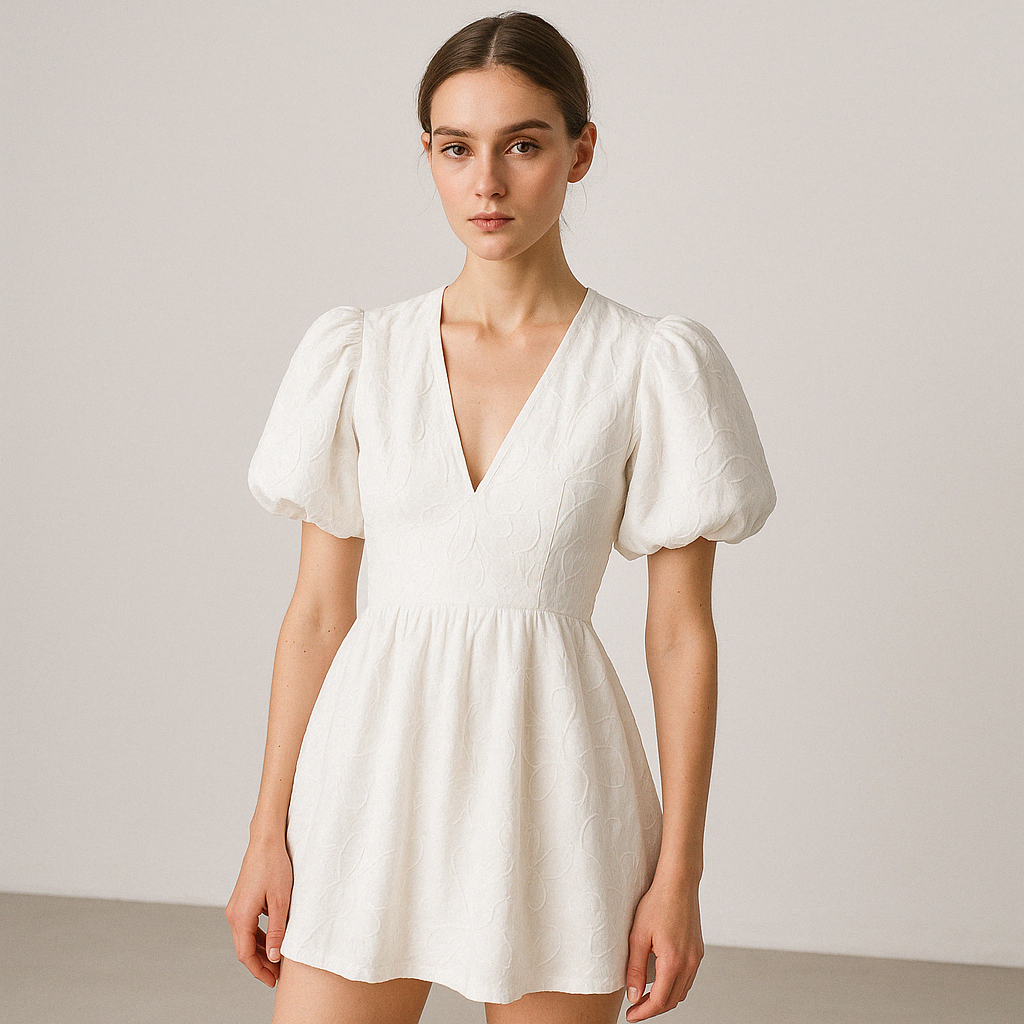 Cette robe courte blanche à manches bouffantes et broderie florale ton sur ton est votre alliée pour des journées lumineuses et pleines de charme. Confectionnée dans un tissu léger avec une coupe flatteuse, elle apporte fraîcheur et féminité à votre look.
