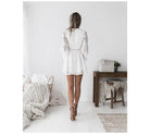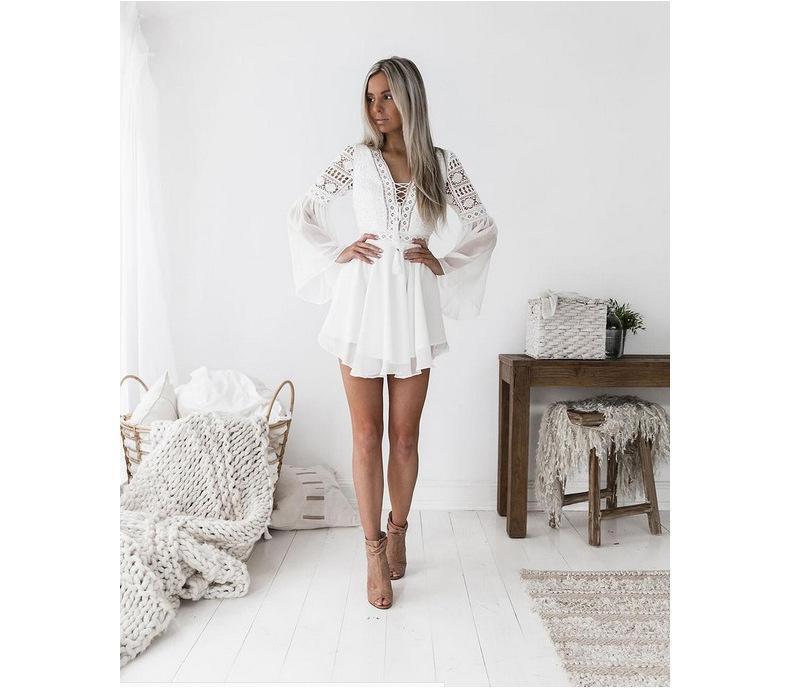 Cette robe courte marie un corsage en crochet délicat à un jupon en mousseline fluide pour un contraste de textures réussi.Le laçage au décolleté et les manches longues transparentes apportent une touche romantique et audacieuse. La taille cintrée met en valeur la silhouette tout en offrant un confort optimal.