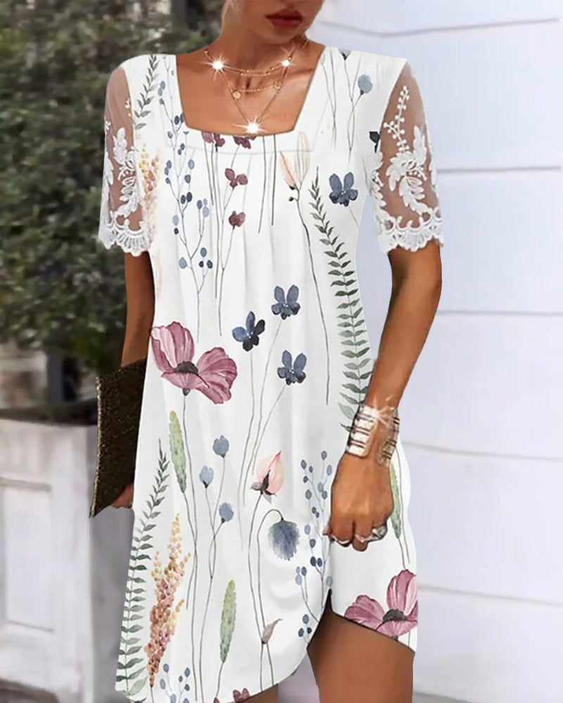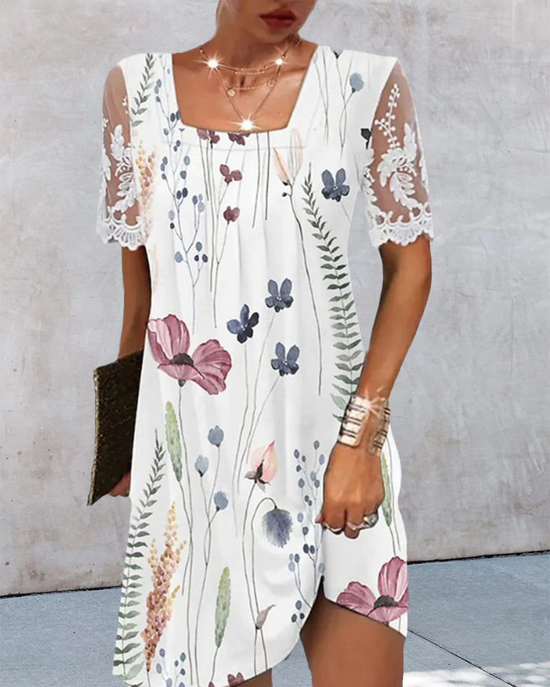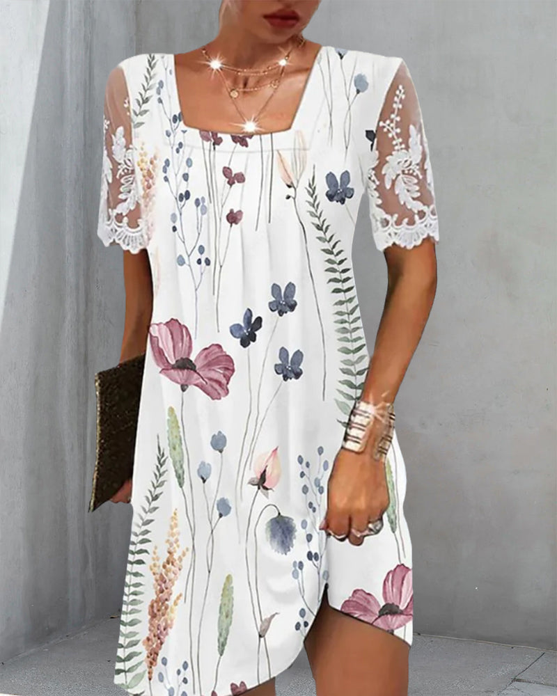 Cette robe courte en mousseline légère se pare d’un imprimé floral délicat et de manches en dentelle ajourée pour un charme romantique. Sa coupe droite fluide et son encolure carrée mettent la silhouette en valeur tout en offrant un confort aérien.