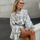 Cette robe courte à imprimé toile de Jouy marie charme classique et modernité avec sa coupe structurée et son col montant. Ses manches bouffantes et sa jupe évasée ajoutent une touche romantique et tendance.