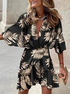 Cette robe courte au motif tropical apporte une touche audacieuse et colorée à votre garde-robe estivale. Sa coupe portefeuille et ses manches larges en font une pièce à la fois confortable, tendance et flatteuse.