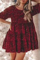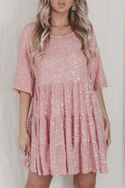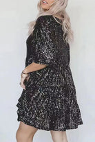 Cette robe courte à volants superposés est entièrement recouverte de sequins pour un effet étincelant. Sa coupe ample et ses manches courtes vous offrent une grande liberté de mouvement tout en gardant une allure sophistiquée. Le tissu léger et fluide garantit un tombé aérien adapté aux soirées dansantes.
