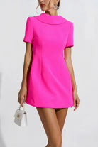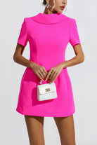 Cette robe courte au col montant revisite le style des années 60 avec modernité et énergie. Sa coupe structurée et sa couleur vibrante en font une pièce forte et stylée.