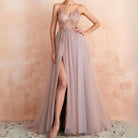 Cette robe de soirée bleu gris à bustier brodé et jupe en tulle est un véritable bijou de féminité et d’élégance. Son haut transparent délicatement travaillé et sa fente subtile en font une pièce à la fois glamour et majestueuse.
