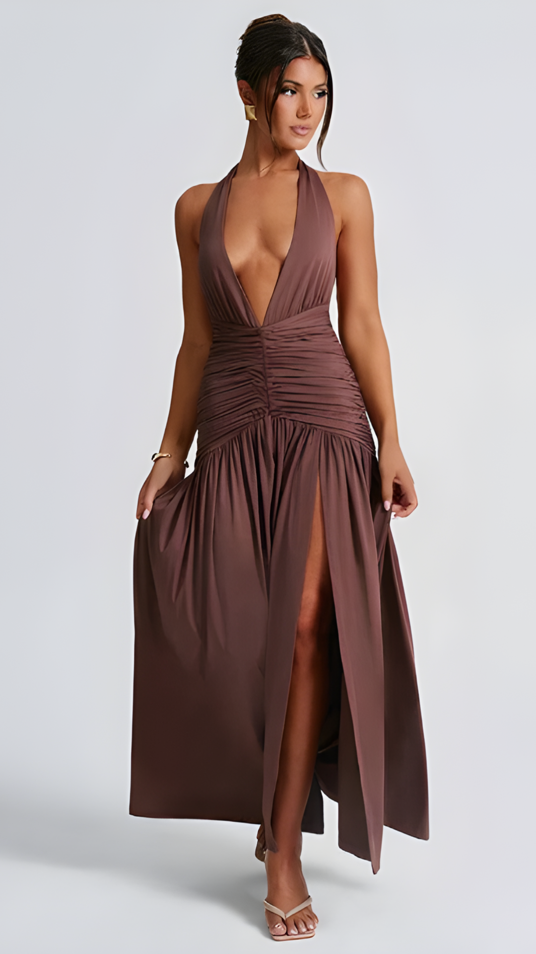 Cette robe longue dos-nu au drapé fluide combine style et aisance pour vos événements les plus marquants. Sa fente latérale et son tissu plissé ajoutent du mouvement et de l’élégance à chaque pas.