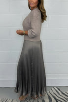 Cette robe effet deux pièces associe un haut en maille doux à une jupe plissée fluide pour un look chic sans effort. Parfaite pour une journée au bureau, un déjeuner ou une promenade d’automne.