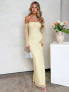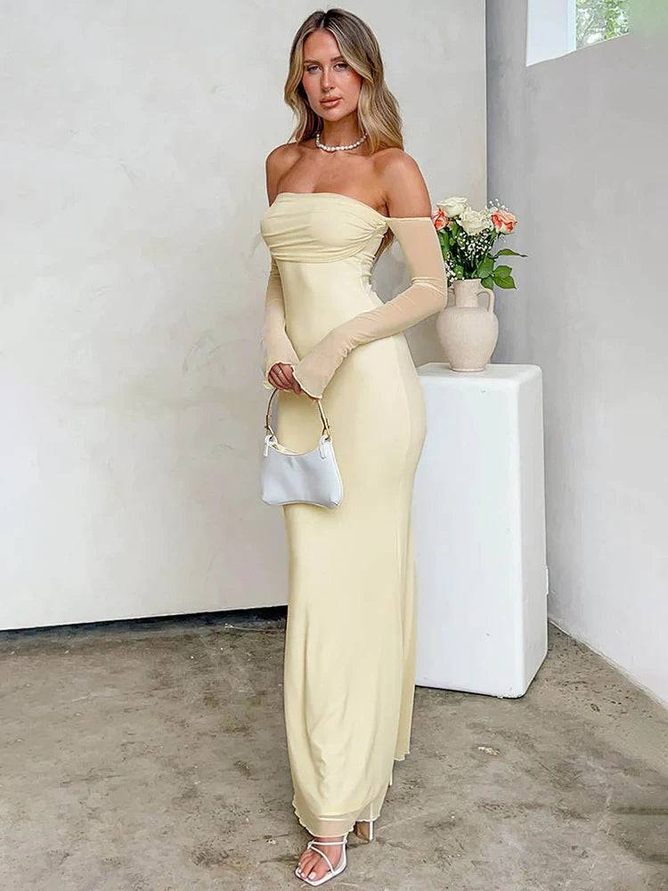 Cette robe longue à manches longues intégrées et épaules dénudées offre une allure féminine et élégante, parfaite pour attirer les regards lors d’occasions spéciales. Sa coupe près du corps met subtilement en valeur la silhouette tout en restant confortable grâce à son tissu doux et extensible.