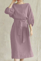 Cette robe en lin vous accompagne du bureau aux sorties avec style grâce à sa coupe midi flatteuse et ses détails soignés. Ses manches amples et sa ceinture à nouer apportent un équilibre parfait entre décontraction et élégance.