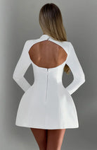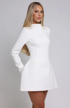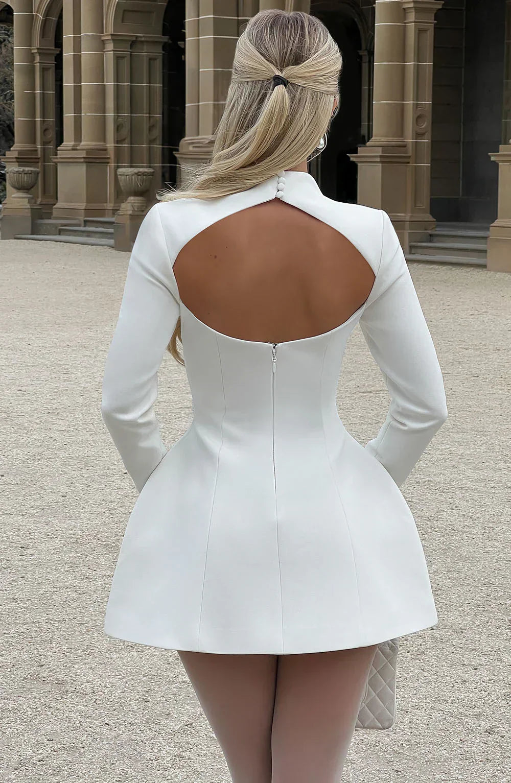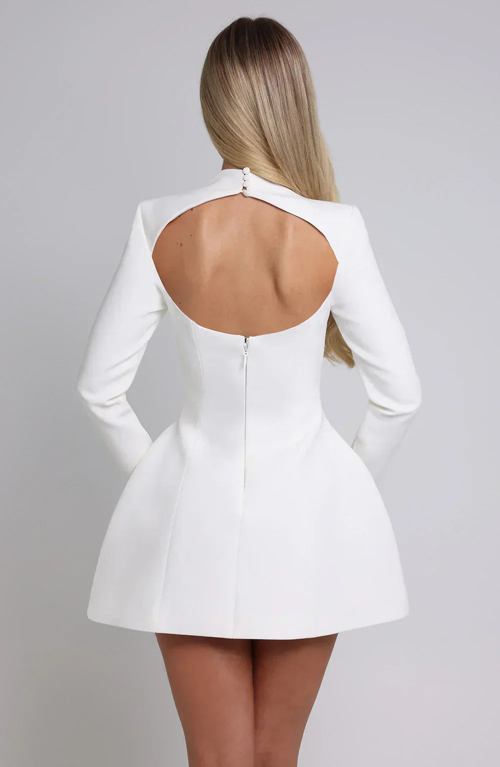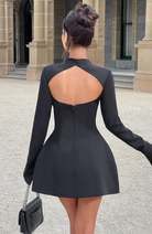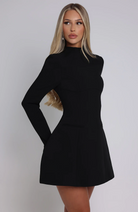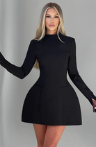 Cette robe structurée à manches longues incarne l'élégance intemporelle avec sa coupe cintrée et son col montant raffiné. Conçue dans un tissu épais mais confortable, elle met en valeur la silhouette tout en apportant chaleur et sophistication.