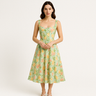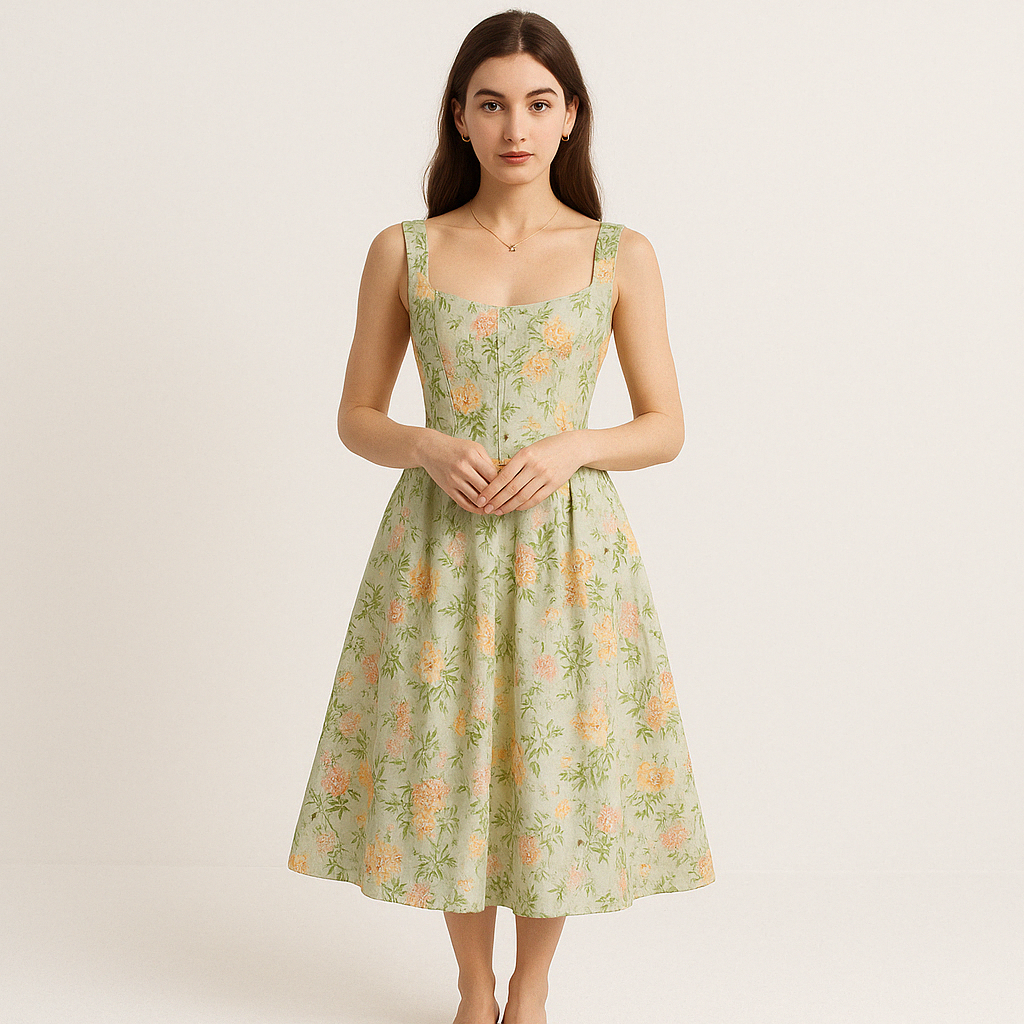 Cette robe mi-longue à imprimé fleuri est une ode à la féminité, idéale pour les journées ensoleillées où élégance et fraîcheur sont de mise. Sa coupe cintrée avec bretelles larges met la silhouette en valeur tout en garantissant un maintien confortable.