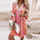 Cette robe fluide allie un imprimé baroque éclatant à des détails en dentelle blanche pour un look à la fois chic et bohème. Sa coupe évasée et ses manches trois-quarts offrent une grande liberté de mouvement avec une touche de féminité.