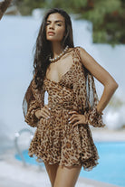 Cette robe courte fluide avec manches longues fendues allie originalité et élégance. Son tissu aérien, son drapé croisé et son ourlet à volants créent une silhouette dynamique et raffinée.