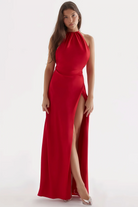 Cette robe longue au col montant incarne l'élégance avec une coupe fluide et une fente haute spectaculaire. Conçue pour mettre en valeur la silhouette avec raffinement, elle allie grâce et intensité.