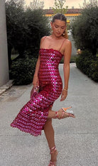 Cette robe longue à sequins est une pièce maîtresse pour celles qui aiment se démarquer avec élégance. Avec sa coupe ajustée et ses fines bretelles, elle sublime la silhouette tout en captant la lumière à chaque mouvement.