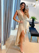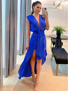 Cette robe asymétrique met en valeur la silhouette grâce à son décolleté plongeant et ses fentes frontales.Confectionnée dans un satin fluide, elle offre un tombé élégant et un confort absolu. La ceinture intégrée permet un ajustement parfait à la taille.