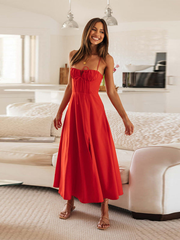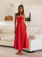 Cette robe bustier sans bretelles met en valeur la silhouette grâce à son top froncé et son nœud central ajustable. Sa coupe fluide et sa fente latérale haute offrent un tombé aérien et une liberté de mouvement. Confectionnée dans un tissu léger, elle assure confort et élégance jusque tard dans la nuit.