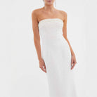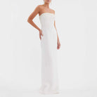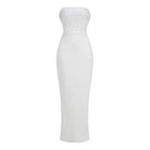 Cette robe longue bustier est une pièce raffinée qui allie grâce et minimalisme. Sa silhouette épurée et sa texture perlée subtilement scintillante en font un choix idéal pour marquer les grandes occasions.