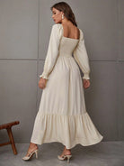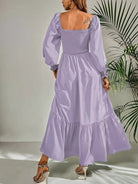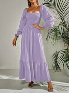 Cette robe maxi marie un décolleté carré structuré à des manches ballon délicates pour une touche de romantisme. Le tissu fluide et léger crée un tombé gracieux, accentué par un volant à l’ourlet pour un mouvement aérien.