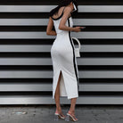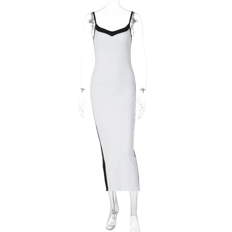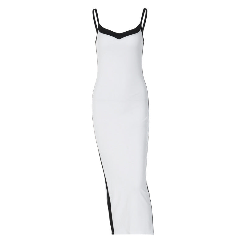 Cette robe longue à bretelles offre une silhouette sportive et élégante, mise en valeur par son jeu de contrastes noir et blanc. Son tissu stretch épouse parfaitement les formes tout en assurant un confort optimal.