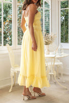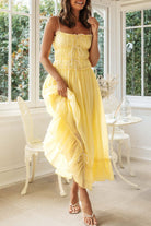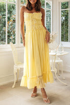 Cette robe fluide associe un corsage corseté orné de dentelle contrastante à une jupe à volants délicats. Le tissu léger et aérien vous assure confort et liberté de mouvement tout au long de la journée.