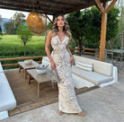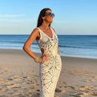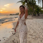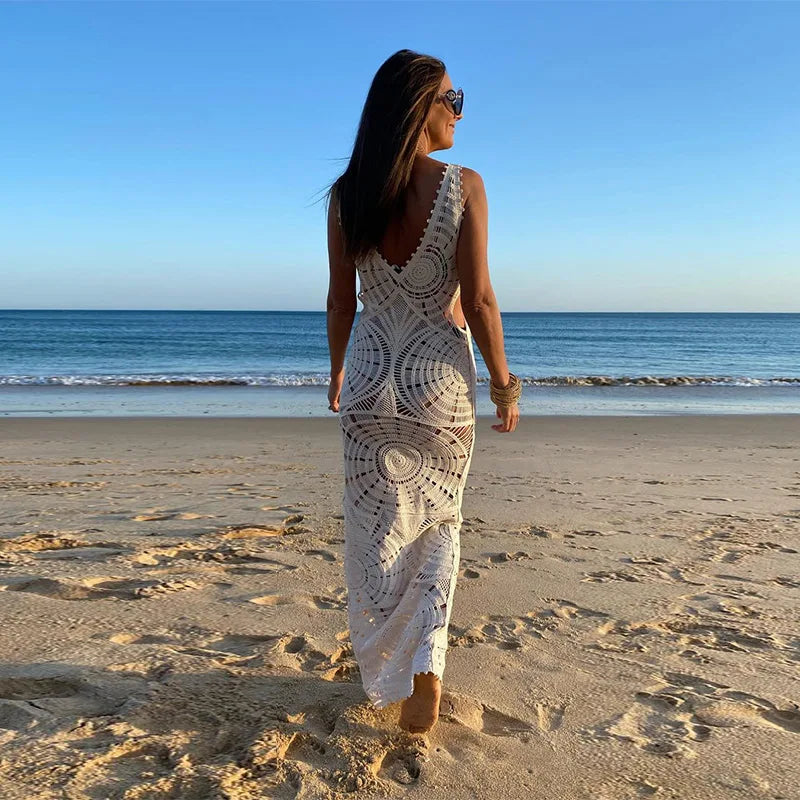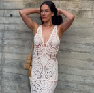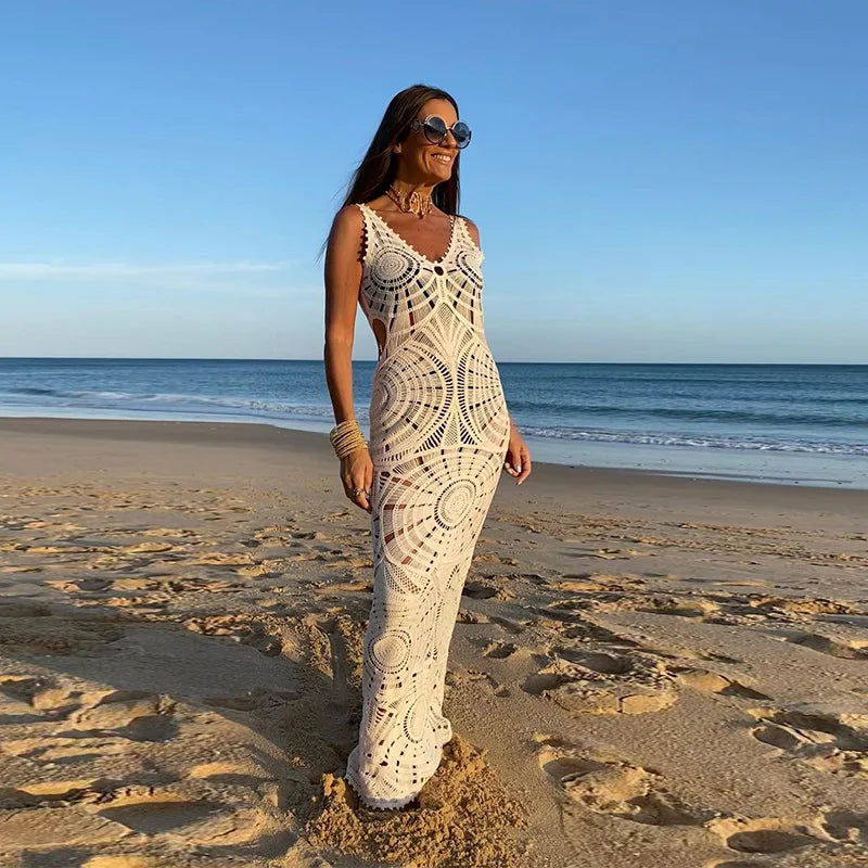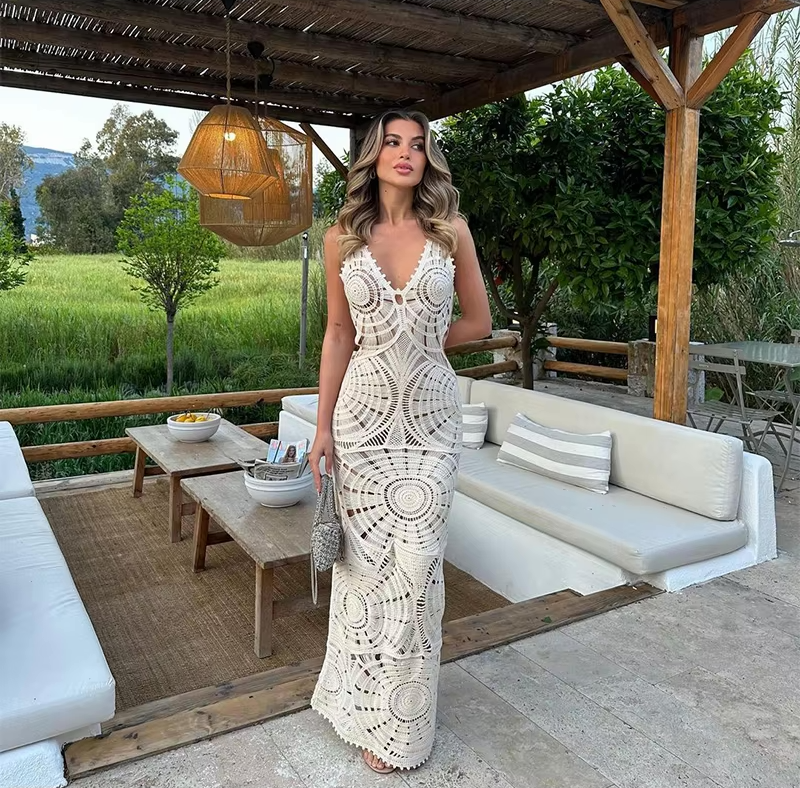 Cette robe longue crochetée à motifs circulaires allie élégance bohème et allure sophistiquée. Sa coupe ajustée sublime la silhouette tout en restant fluide et légère.
